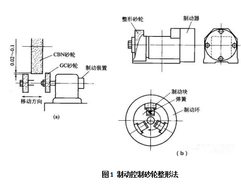 力按壓CBN砂輪時(shí),整形砂輪則隨CBN砂輪一起轉(zhuǎn)動。另外,整形砂輪還做往復(fù)移動,以一定的滾壓力進(jìn)行修整。在整形砂輪軸上安裝制動器的目的是為了使整形砂輪與CBN砂輪間產(chǎn)生相對速度。圖1(b)所示為制動器示意,制動塊因受彈簧力作用向制動環(huán),依靠摩擦作用降低整形砂輪速度。整形砂輪與CBN砂輪的相對速度越大,整形效率越高。